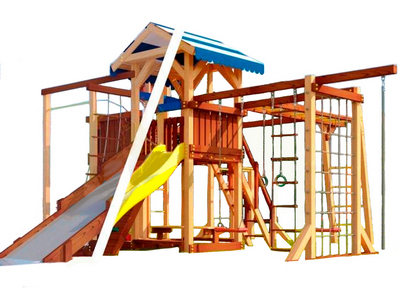 - В центре комплекса - игровая башня с яркой двухцветной крышей из материала “Оксфорд”. Чтобы подняться в неё, нужно преодолеть сетку-лазалку, скалодром или лестницу-трап с узкими ступенями. Спуститься вниз можно теми же путями, а также самым интересным и весёлым - съехать по трёхметровой горке. В зимний период горка может быть заменена на деревянный скат (поставляется в комплекте). Ширина ската 93 см позволяет кататься с него на ледянках и тюбингах.