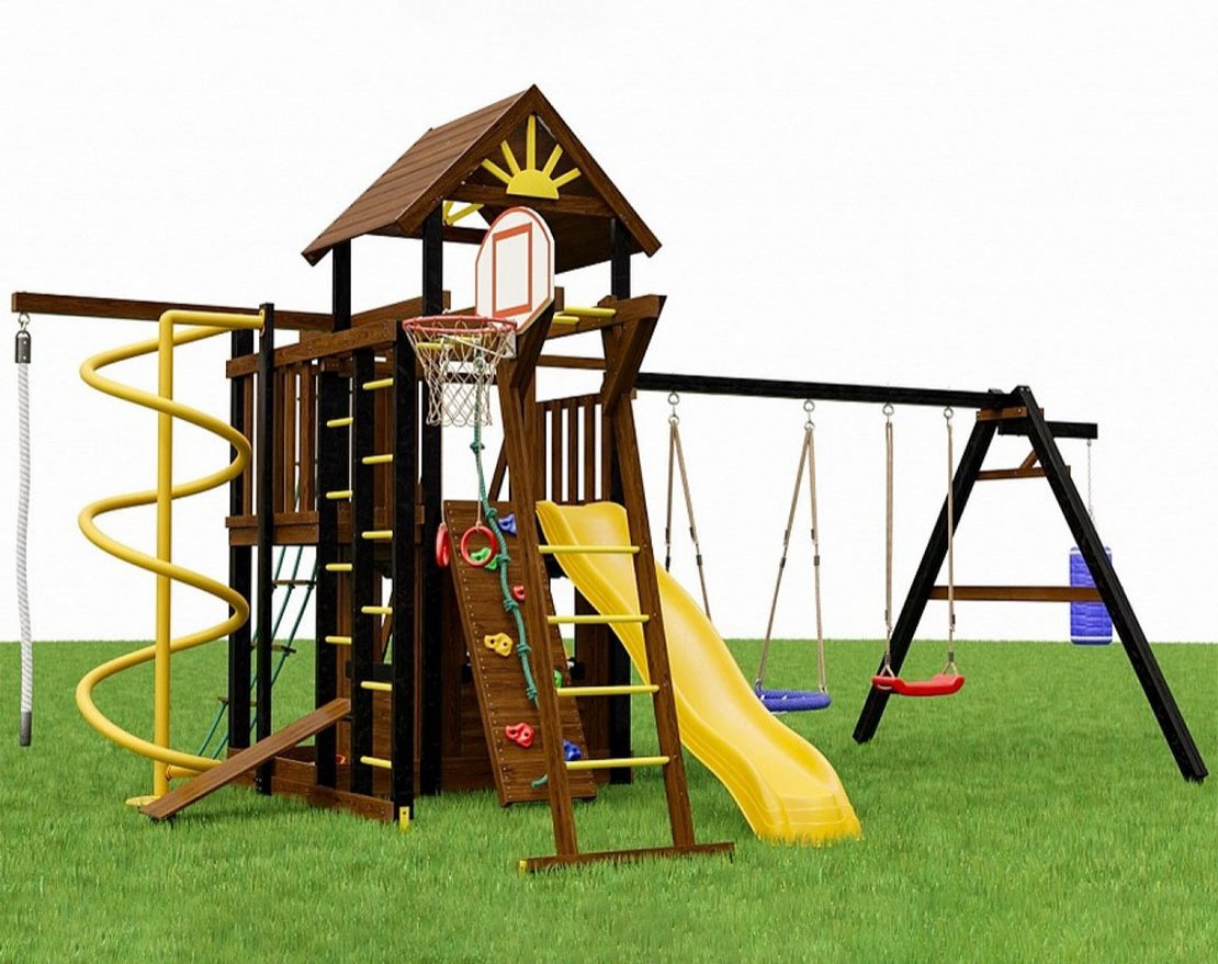 Игровая площадка Айова 3 — идеальное пространство для активных игр и личной зоны ребёнка на свежем воздухе. Помимо классических спортивных элементов, модель дополнена уютным домиком и декоративными деталями, которые делают её ещё привлекательнее.