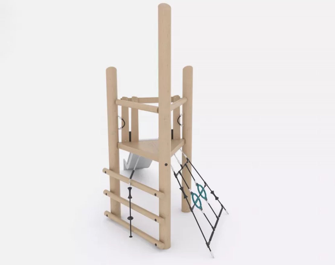 Состоит из опорных стоек, перекладин, канатной сетки и открытой металлической горки с защитными бортиками. Для большего комфорта, канатная сетка оснащена пластиковыми уступами.