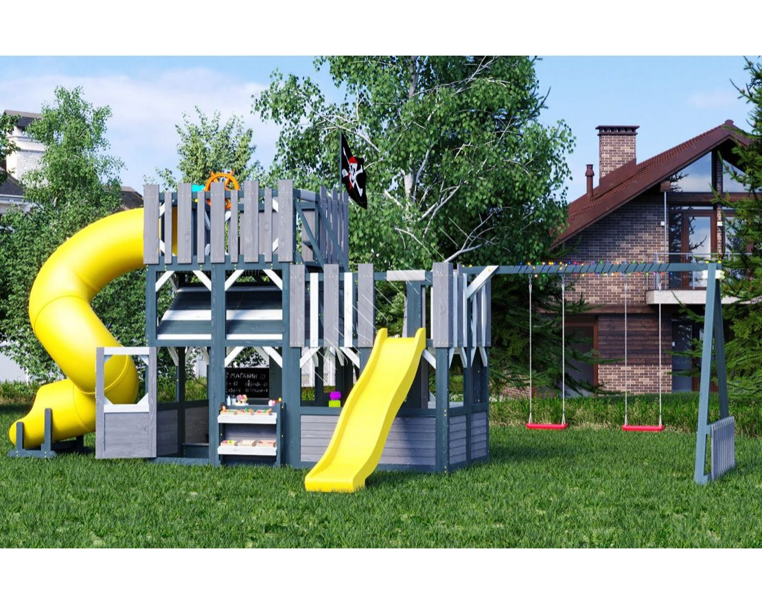 - Стильный дизайн в серых и жёлтых тонах делает площадку украшением двора.