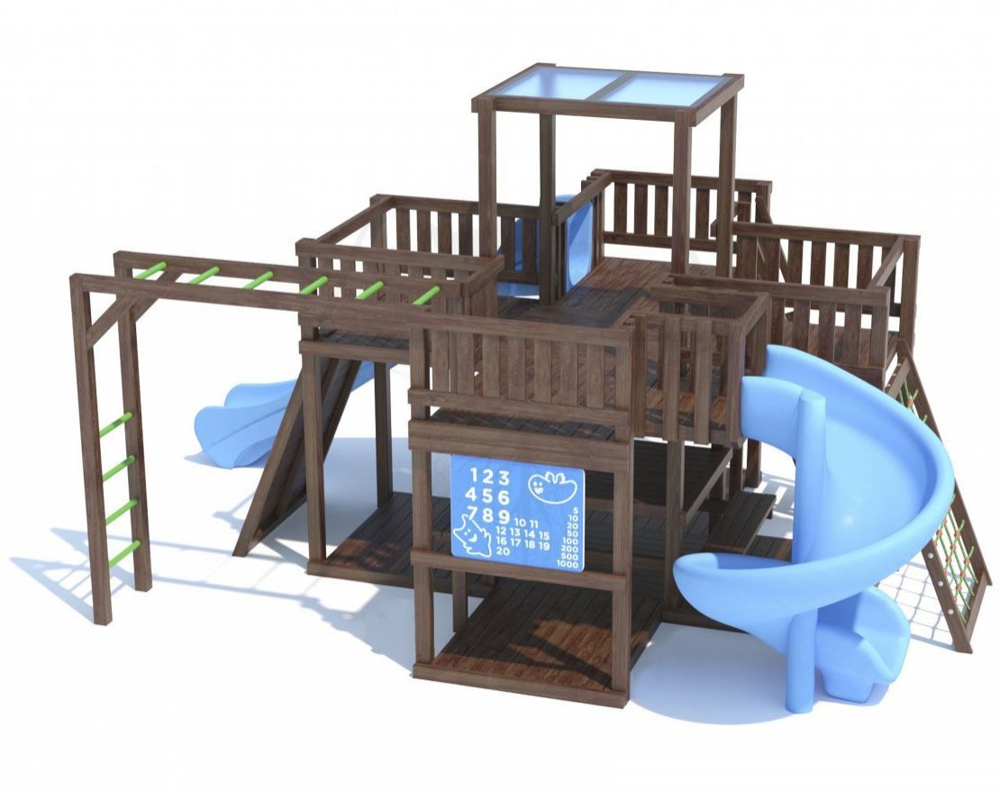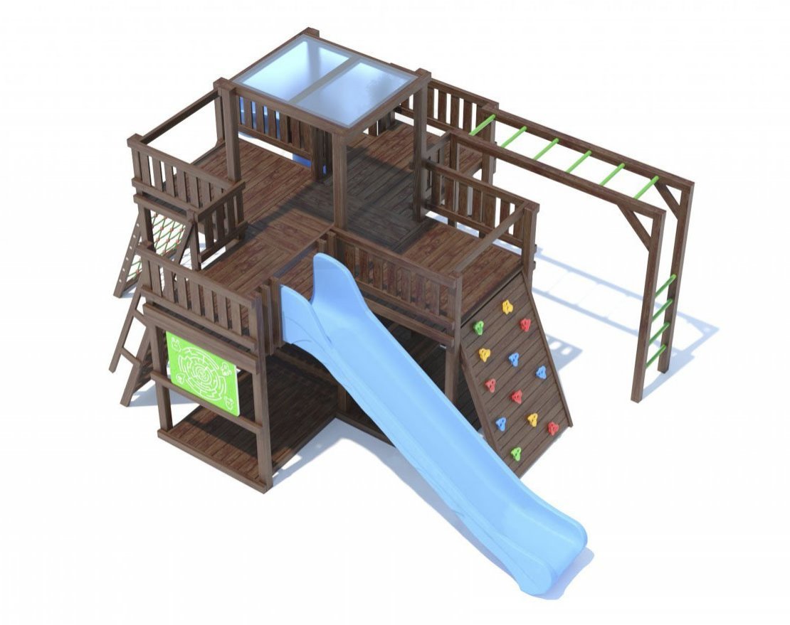 Основа детской игровой - спортивной конструкции – башня и четыре балкона «серия F». Конструкция оснащена плоской прозрачной крышей, встроенным полом, встроенным столиком с лавками в нижней части конструкции, пластиковым антивандальным скатом с превосходной скользящей поверхностью, антивандальным винтовым скатом с переходным мостиком, «П»-образным деревянным рукоходом, скалодромом, канатной лестницей с армированным канатом, деревянной лестницей, антивандальными пластиковыми игровыми панелями. Для безопасности ребенка предусмотрены перила на лестнице, заборчики и ограждения над зонами препятствий (скат).