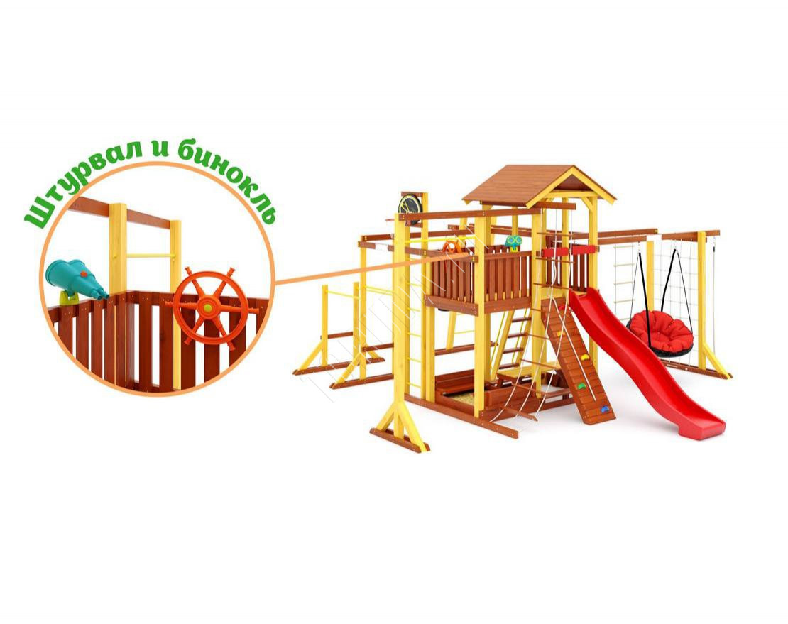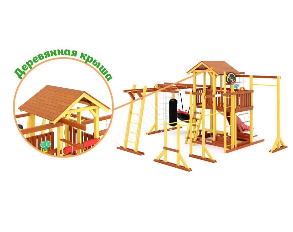 - Многообразие игровых элементов: в комплектацию входят скалодром, сетка-лазалка, турники, гимнастические кольца, песочница с крышкой, которая трансформируется в две лавочки, и многое другое.