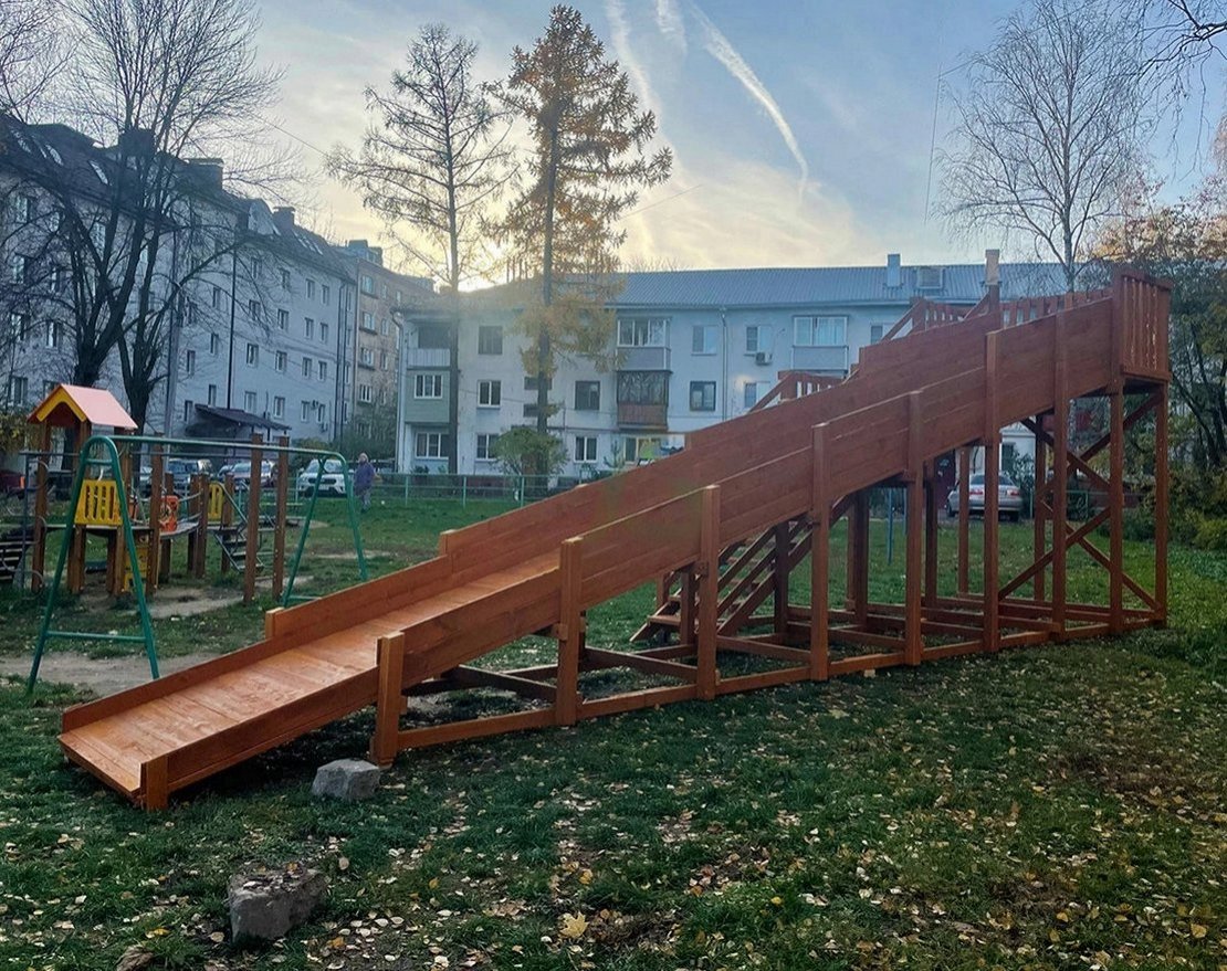 Модуль имеет приятный дизайн, который представлен в виде тёплого цветового оформления. Несущее изделие можно установить в общественном парке, возле частного дома, многоэтажек. Ведь благодаря тому, что лестница и скат располагаются перпендикулярно друг к другу, модуль не занимает лишнее место.
