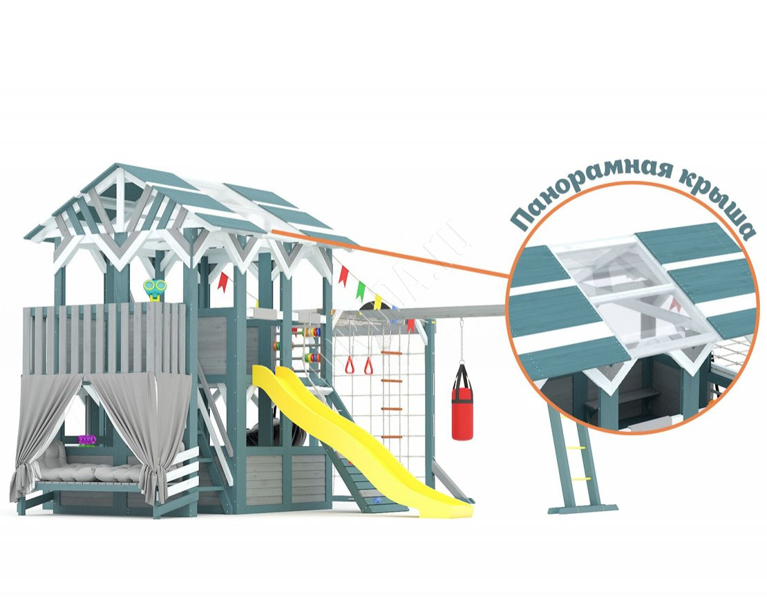 Этот комплекс сочетает в себе игровую и спортивную площадку, а также уютный детский домик с просторным игровым пространством. Он открывает двери в мир сказочных приключений для детей разного возраста (от 3 до 16 лет), развивая их физические способности и воображение.