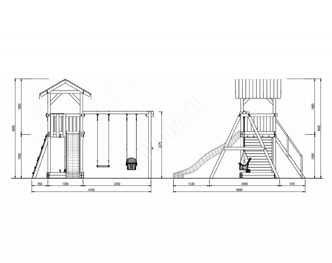 Комплекс имеет небольшие размеры и занимает минимум пространства. Большого выбора игрового оборудования тут нет. Однако это не способ экономии, а скорее формат, концепция позволяющая сделать площадку компактной. Каркас - деревянный. Положительно сказывается на сроке службы применение клееного бруса. Он не меняет форму с годами, не боится сырости или снега.