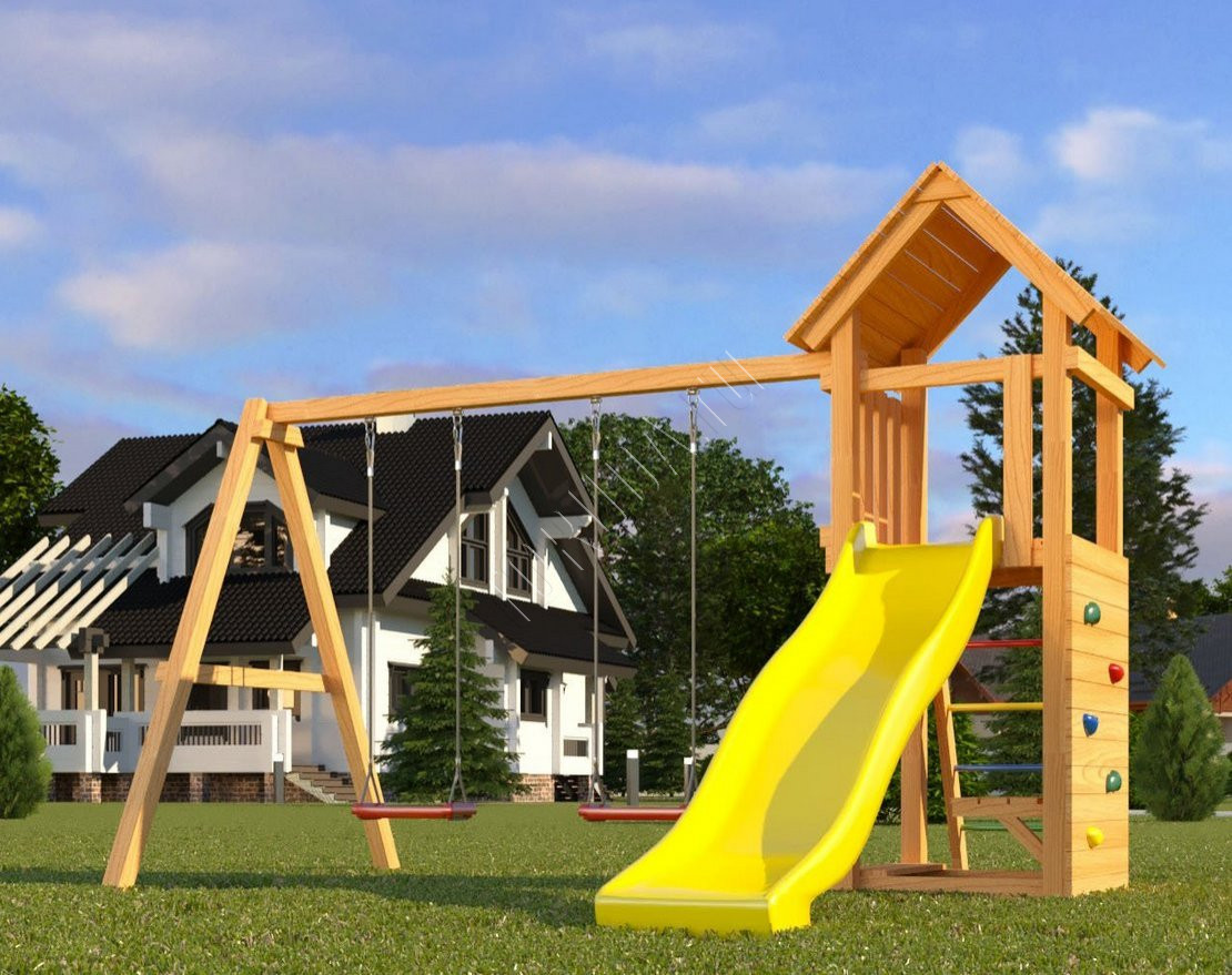 Основной материал натуральный и экологичный – это шлифованный клееный брус, края которого скруглены. Занозы и ссадины исключены. Детская площадка безопасна: конструкция рамы произведена согласно ГОСТ, все крепежи закрыты заглушками, а подвесное снаряжение сертифицировано и создано в Бельгии специально для детей.