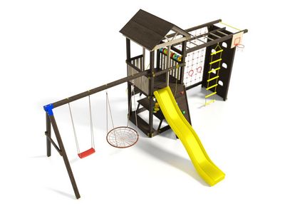 Для максимальной защиты ребёнка от травм, все углы имеют закруглённую форму, крепеж надежно скрыт пластиковыми заглушками. Опоры изготовлены из клееного бруса толщиной 90*90 мм.