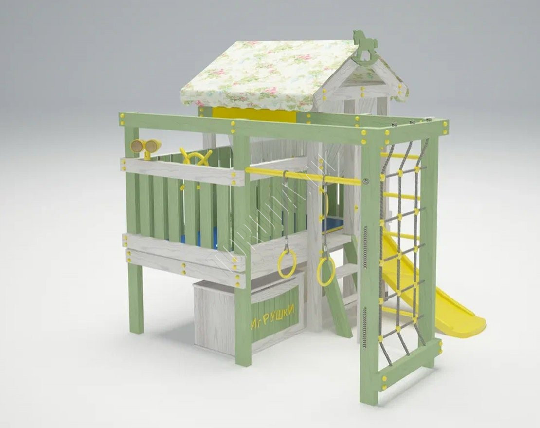 - Модель включает в себя три объединенных зоны: домик на платформе высотой 60 см, балкон и спортивный комплекс. Пространство под детской площадкой позволит хранить небольшие ящики. Ребёнок может положить туда мягкие игрушки, машинки, мячи и прочие предметы.
