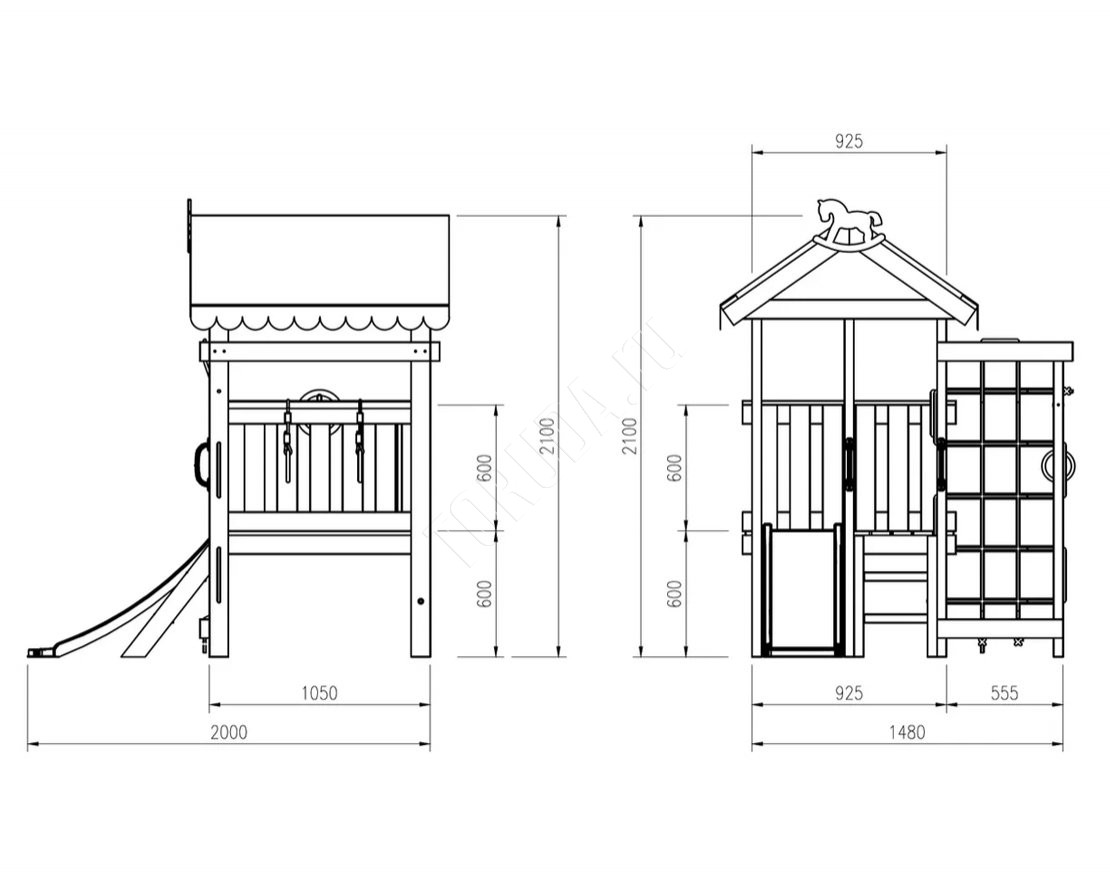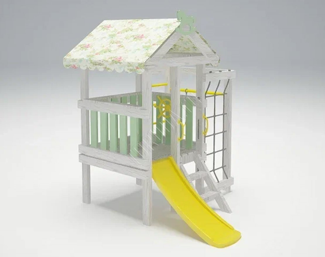 Эта универсальная спортивно-игровая площадка не занимает много места. Домик стоит на платформе в 60 см от уровня пола. Под ней можно расположить боксы с детскими игрушками или небольшими вещами. Подняться можно с помощью удобной широкой лестницы, каркас которой сделан из дерева.