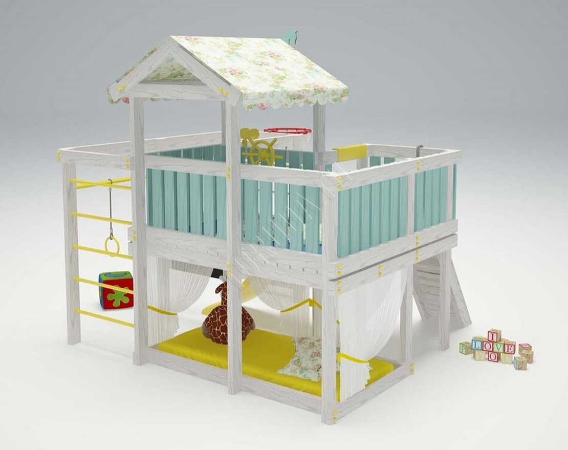 - Основа модульной конструкции – домик. Высота от поверхности пола до платформы составляет 90 см. Взобраться туда непросто. Сделать это можно только по мини-скалодрому. Для облегчения задачи добавили удобный канат. Подъём станет хорошей тренировкой для мышц мальчиков и девочек. Слезать со второго этажа легче. Ребёнок может скатиться по горке. Её длина 175 см.