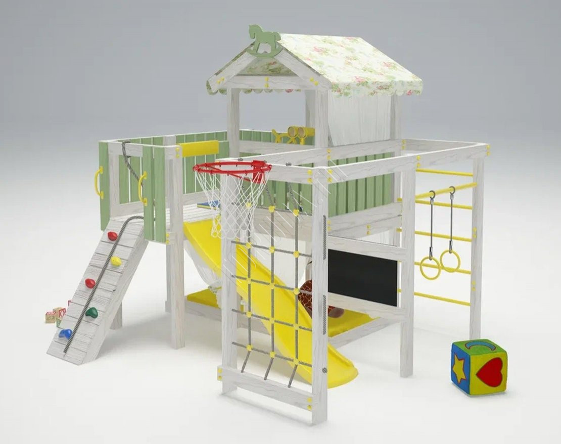 - Рядом с башней расположили спортплощадку. Она понравится активным малышам. Шведская стенка и удобная сетка-лазалка с крупными ячейками подходят для тренировки силы и ловкости. На гимнастических кольцах и турнике малыш быстро разовьёт мышечную силу и сформирует правильную осанку.
