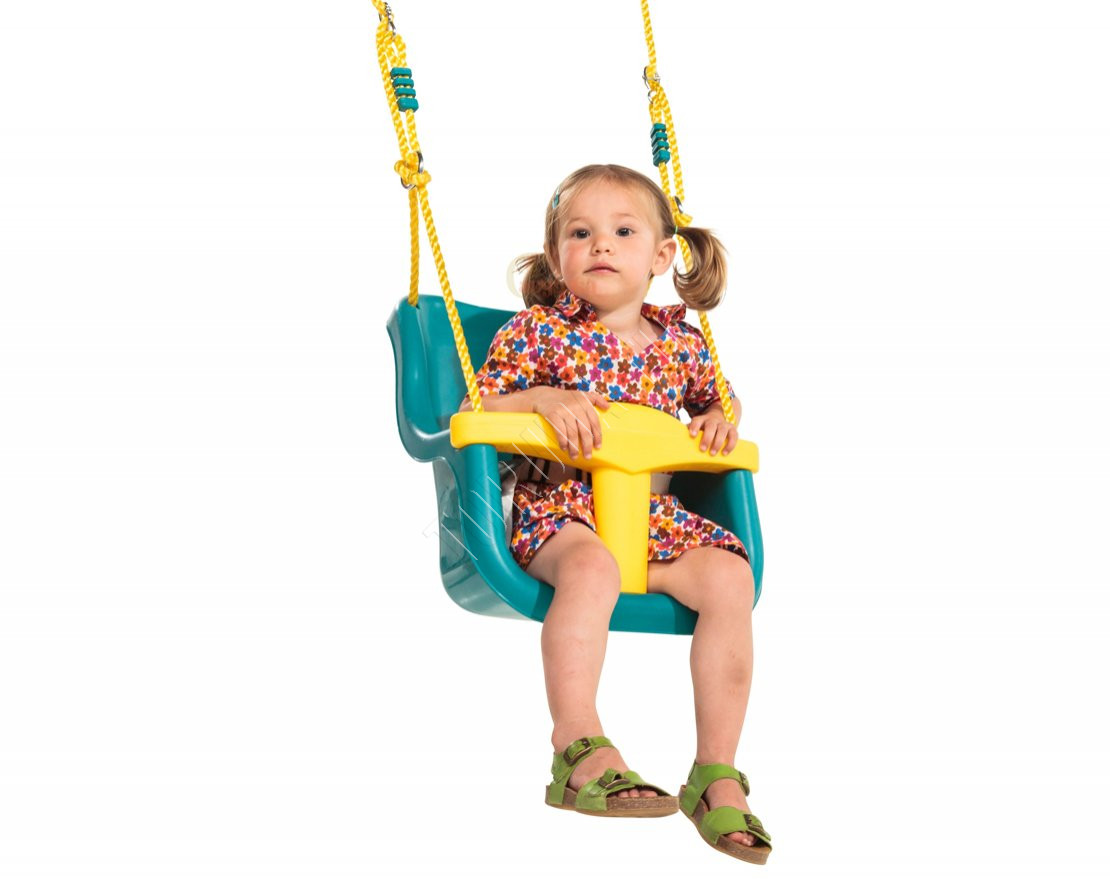 Качели оснащены снимающимся разделителем, который препятствует выпадению ребёнка, и ремнём безопасности.